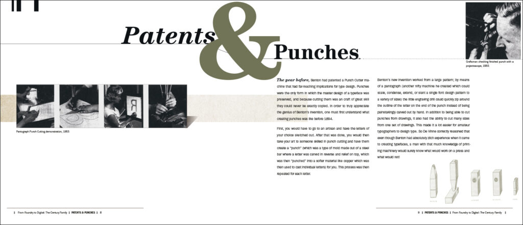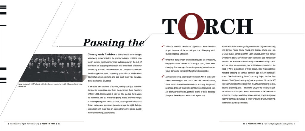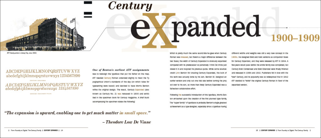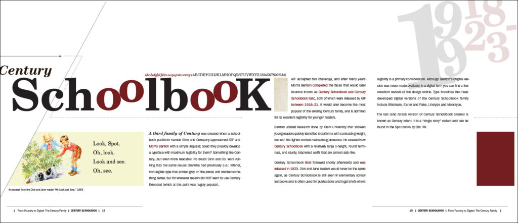 This 28 page booklet visually chronicles the history of the Century typeface, and showcases the different fonts that belong to that family. The above samples are some of the spreads from the book.