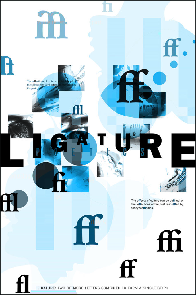 A ligature is two or more letters combined that form a single glyph in typography. For this project I had to visually create a phrase using five ligatures that related to my thesis topic on Transculturalism and Design. Transculturalism is characterised by cultural fluidity and the dynamics of cultural change; whether by conflict, necessity, revolution or the slow progress of interaction, different groups share their stories, symbols, values, meanings and experiences. In my thesis I explore how this philosophy could be used as a tool to expand our visual language and promote diversity in graphic design. The phrase 'the effects of culture can be defined by the reflections of the past reschuffled by today's affinities' directly relates to my thesis and uses all five ligatures.