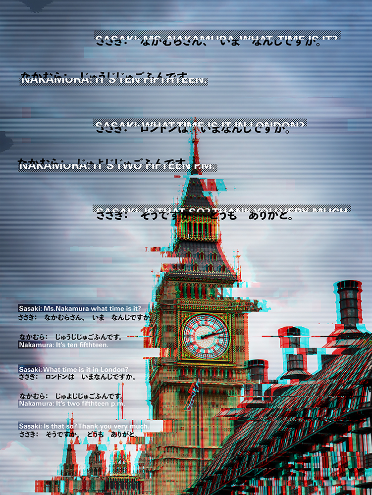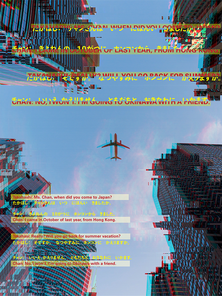 This series was inspired by my love of languages and the struggle that comes with learning all the rules, vocabulary, and patterns that are often different from your mother tongue . After studying Japanese for a couple of years and having some issues maintaining some of the vocabulary and symbols, I decided to add a visual element to my lessons in this series of 18×24 posters. Glitching the images and arranging the halves of the Japanese and English translations together represents my thinking process while studying a new language, while the correct textbook translations appear below.